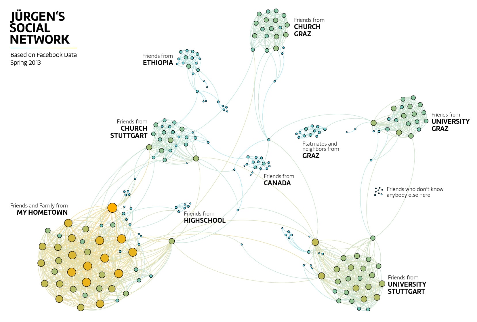 This is the visualization of my personal ‘social network’, based on my Facebook friends in early 2013. Each colored dot represents a Facebook friend and each line between two dots represents a connection. In other words, these people know each other. The bigger a dot, the more connections the person has within the network. The color indicates the number of connections from a cold blue (no connections) to a warm orange (many connections). Dots with connections attract each other and unconnected dots are pushed away. This creates the characteristic clusters. By looking at the people in each cluster, it’s really easy to identify the corresponding group. They are mostly based on location (cities and countries) as well as “common interest” in the sense of university, church or the like.